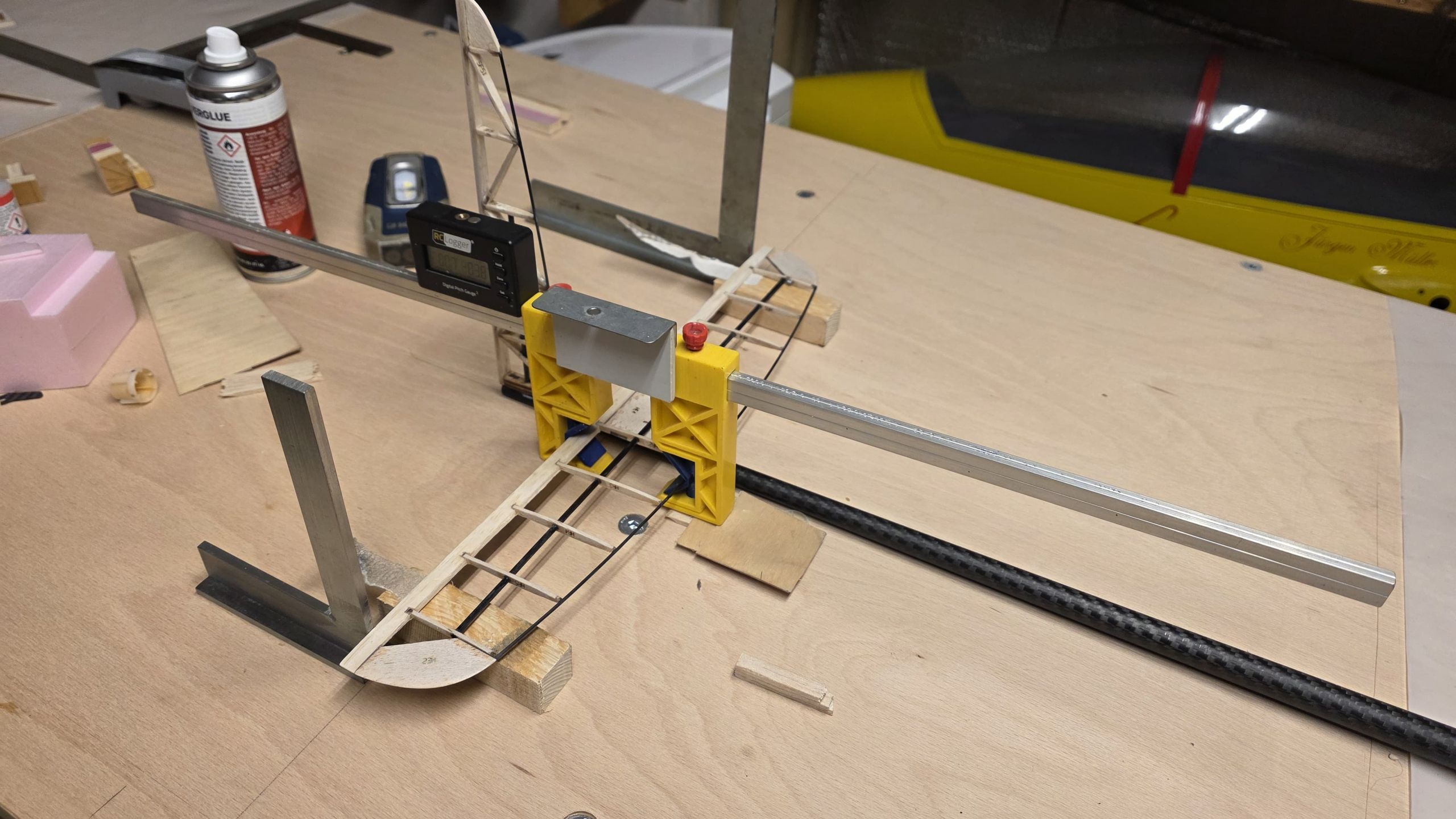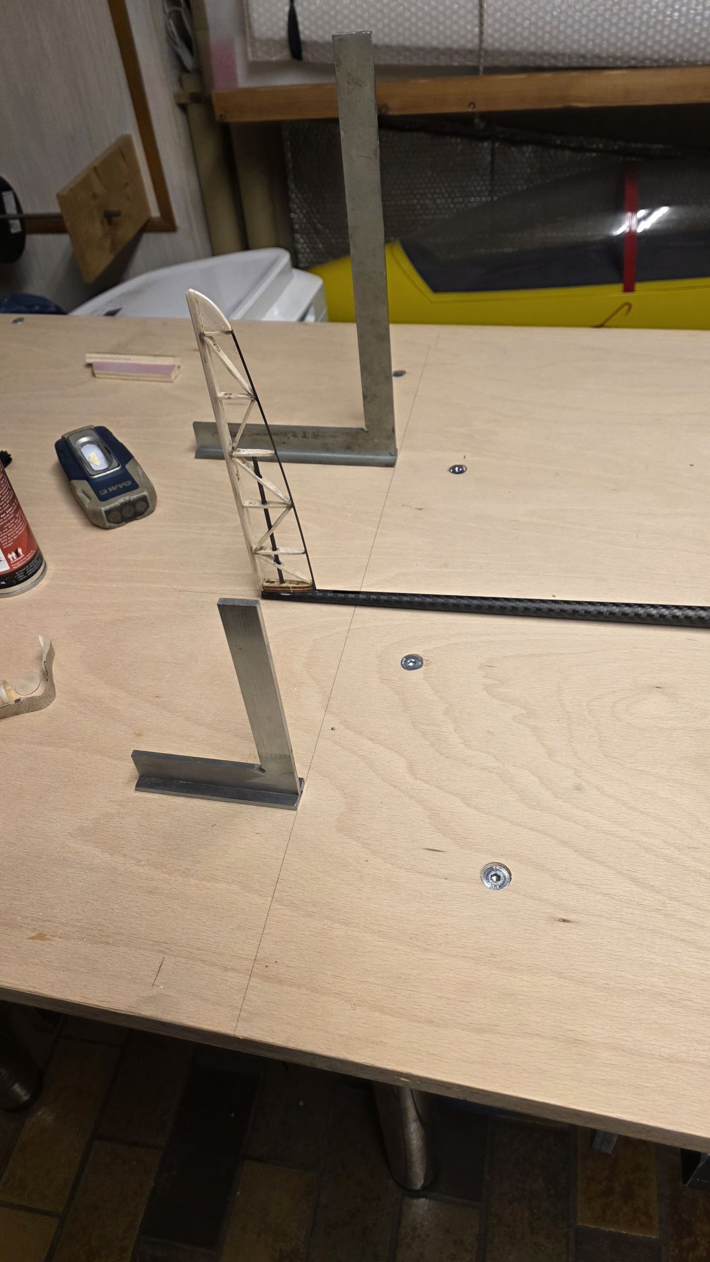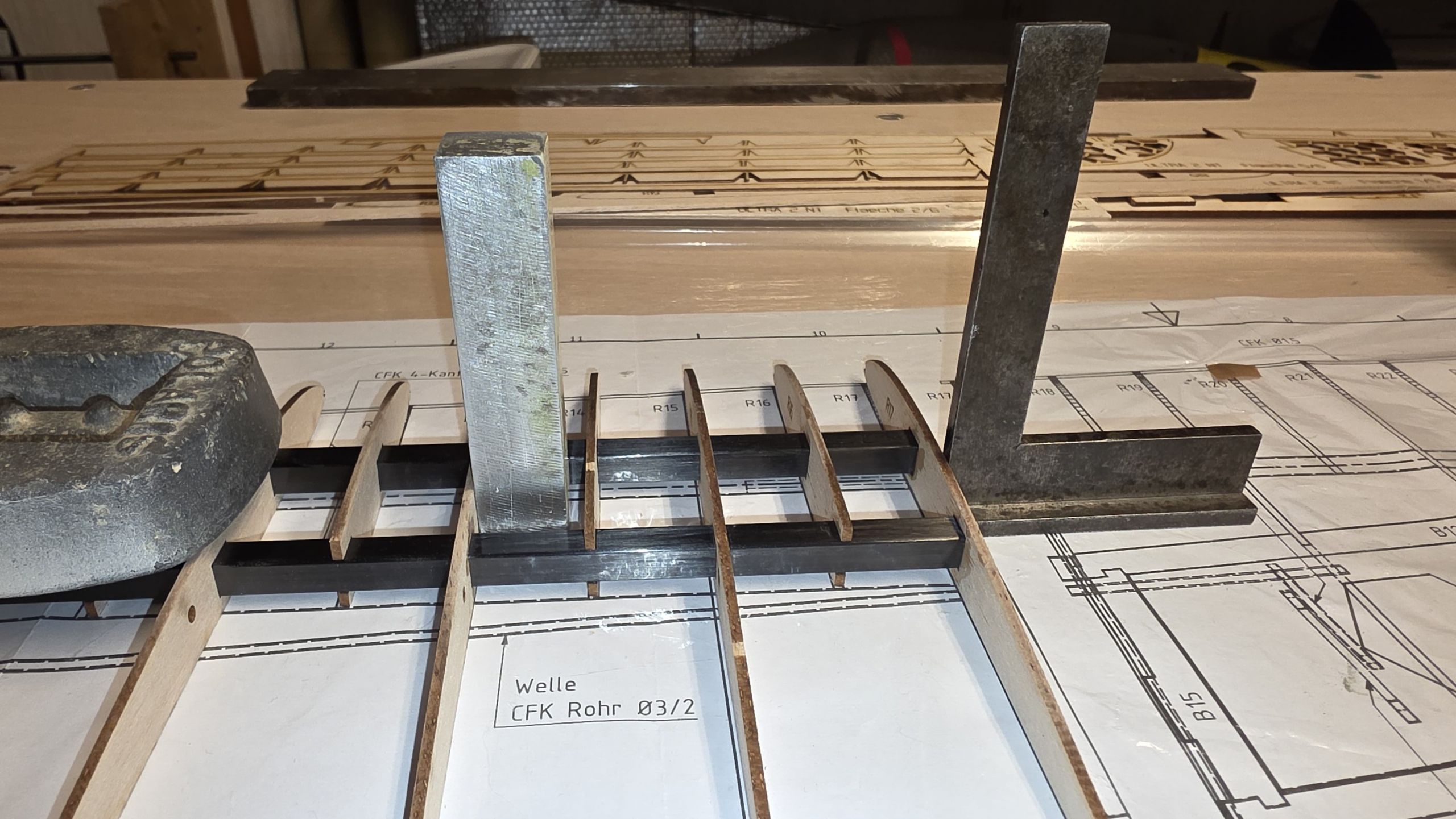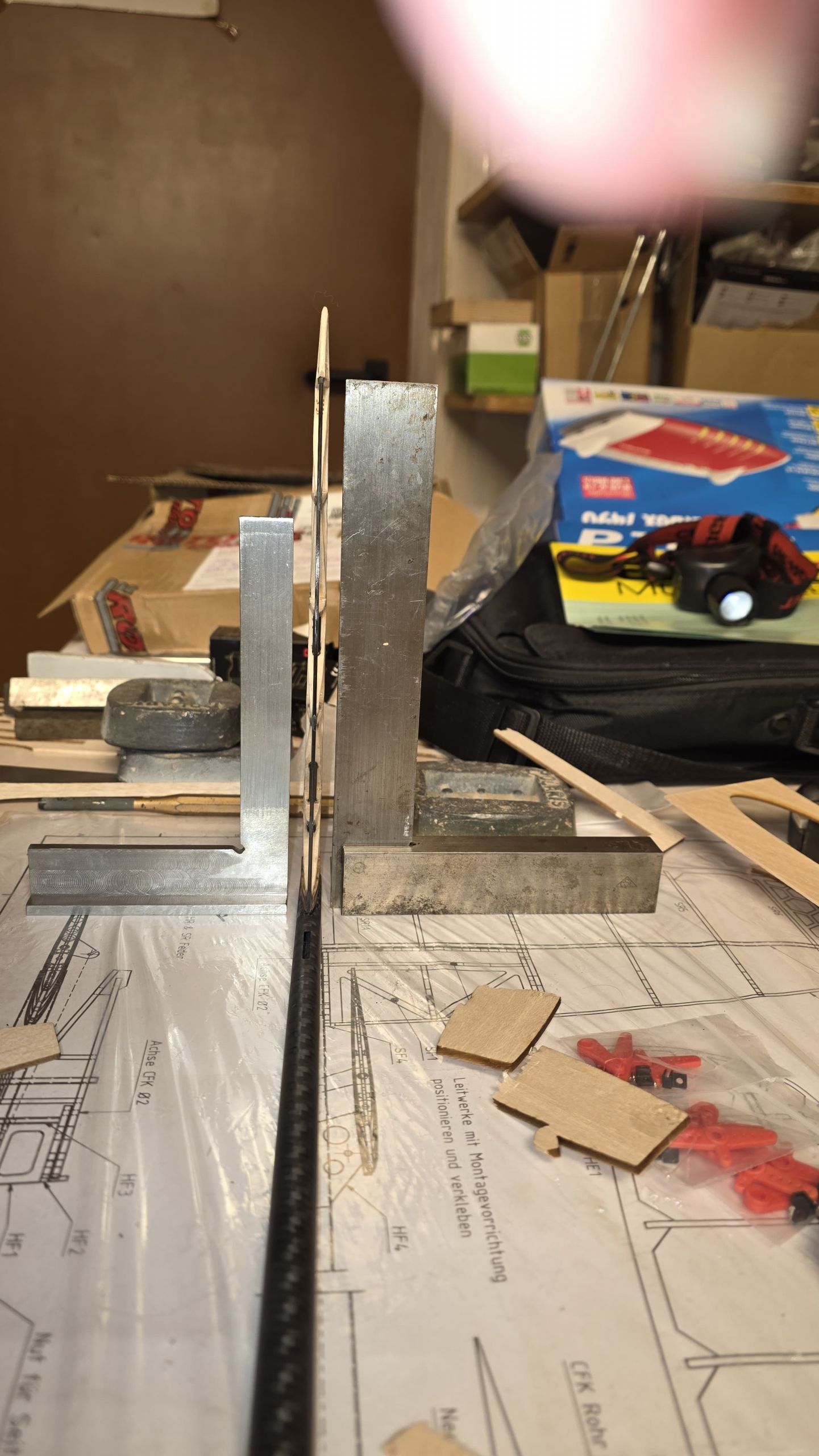 📐 Zuerst habe ich den Rumpf zwischen zwei Winkel gestellt und durchgepeilt, um die genaue Ausrichtung sicherzustellen.