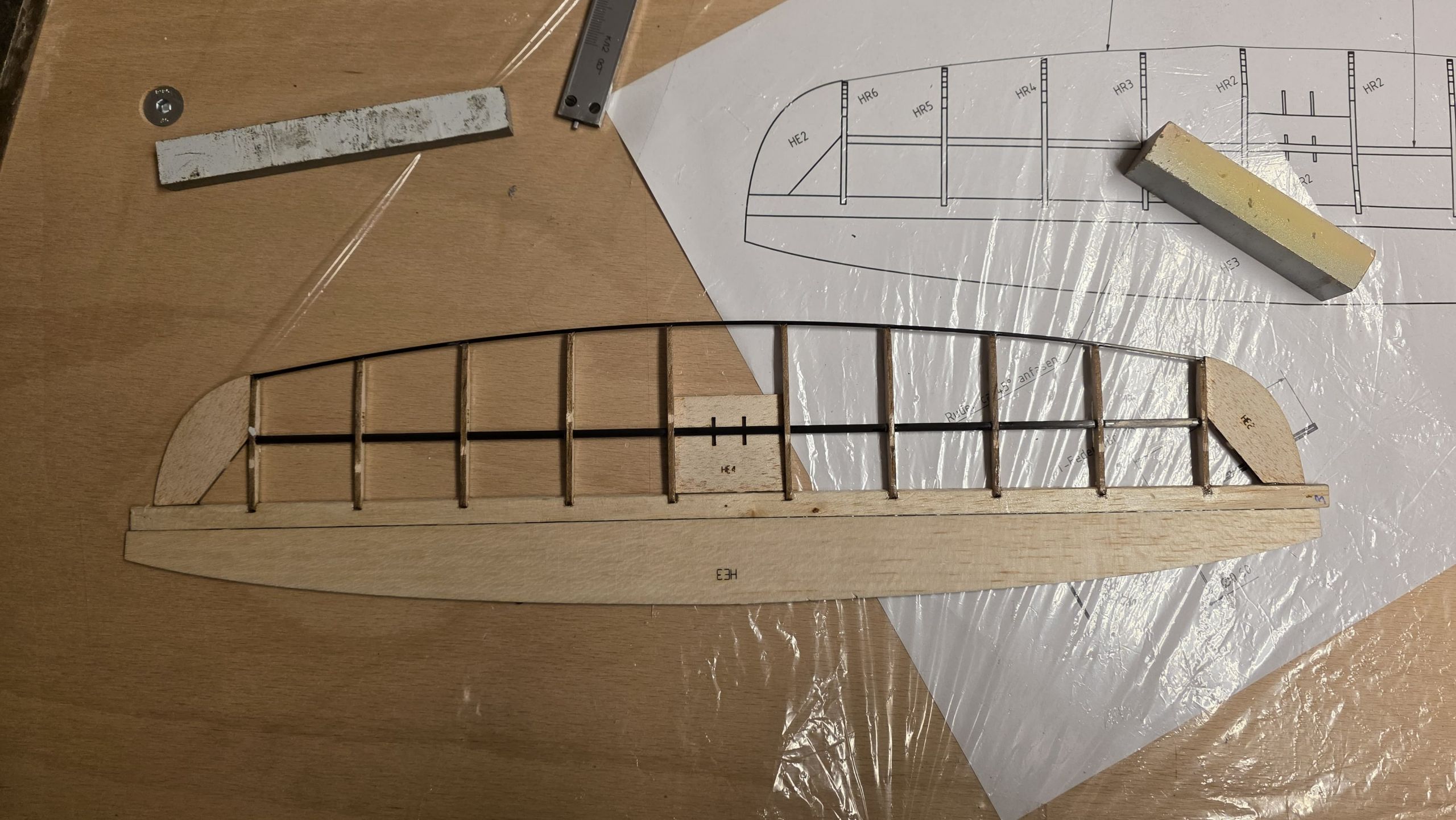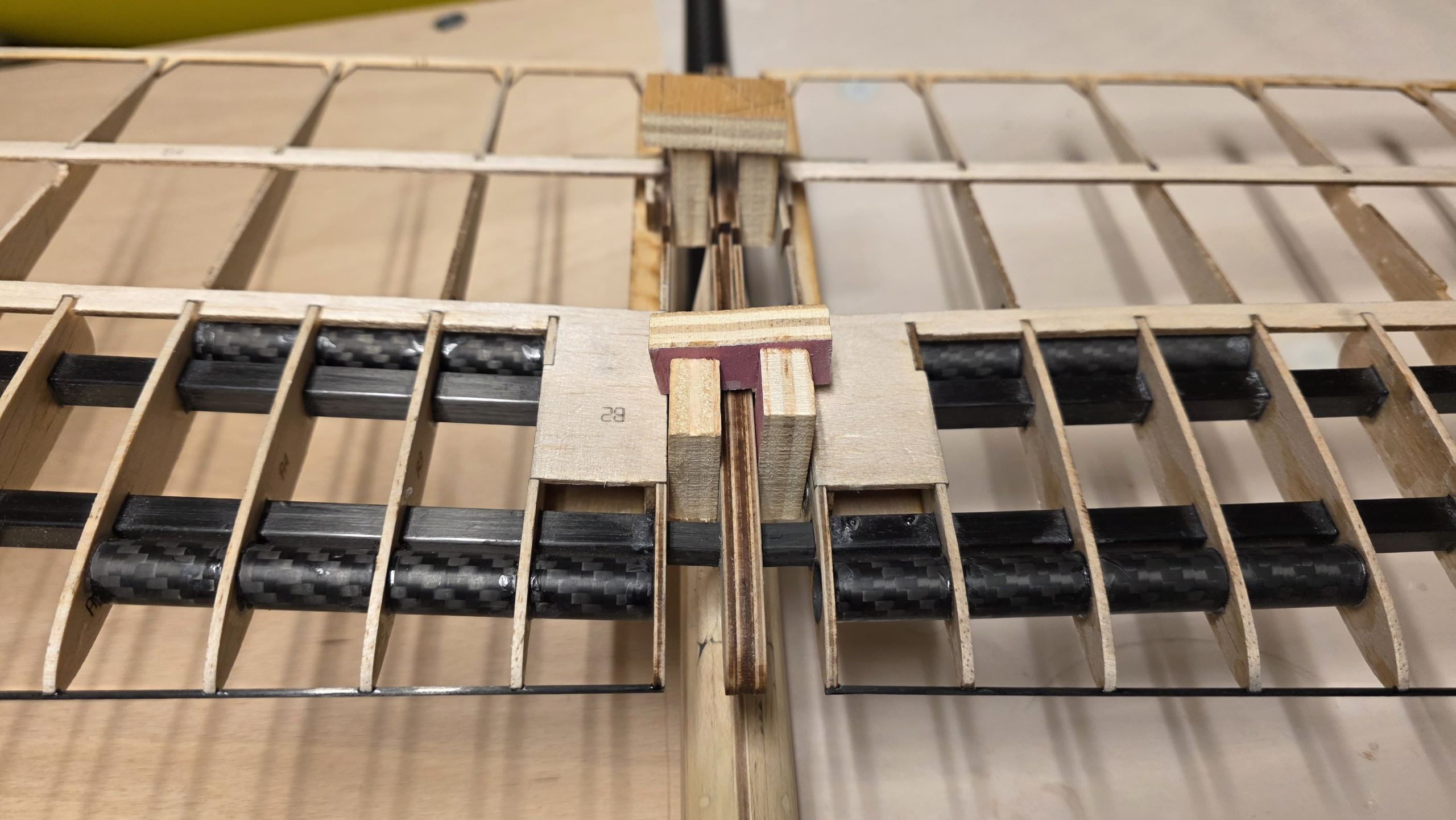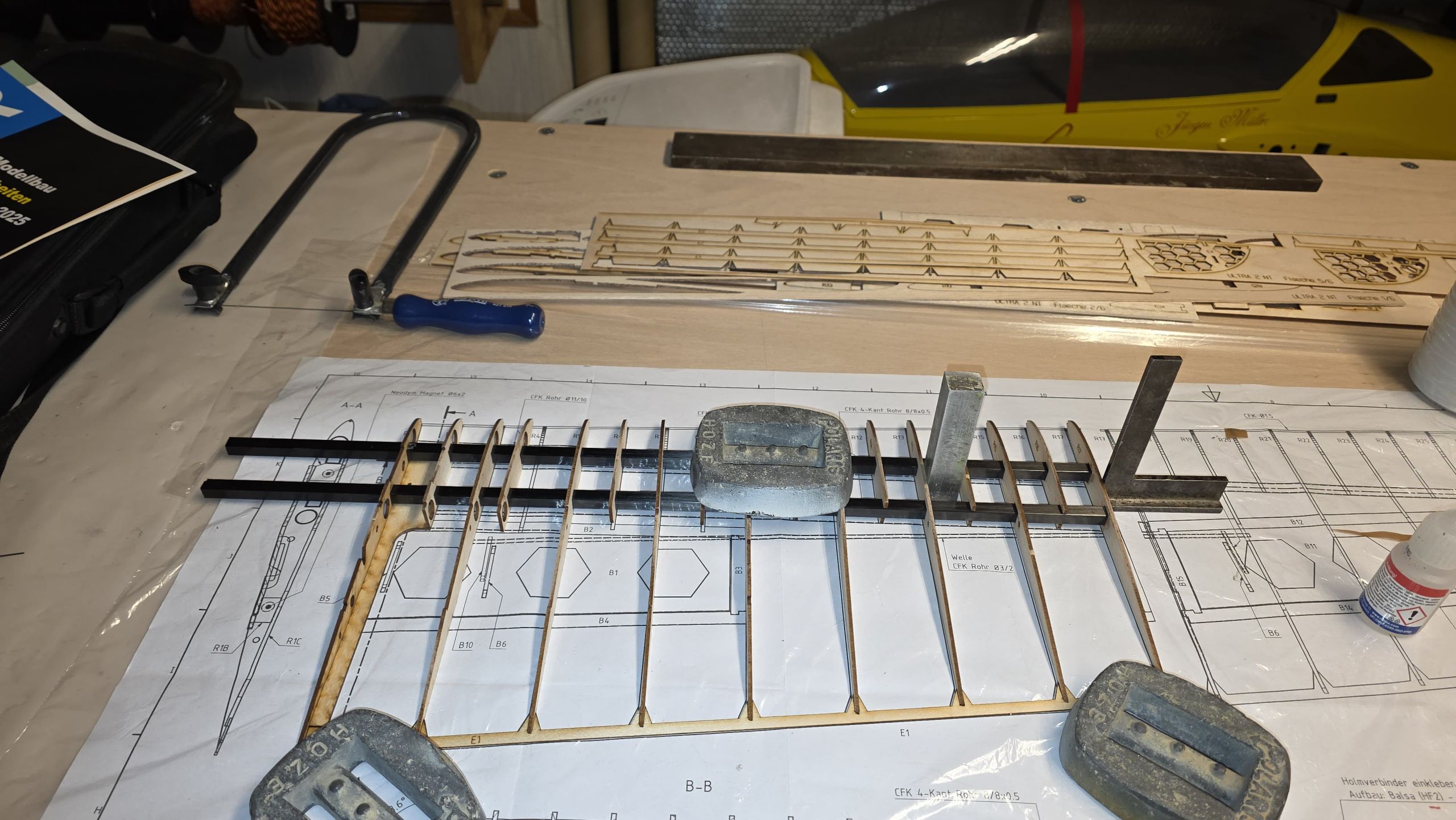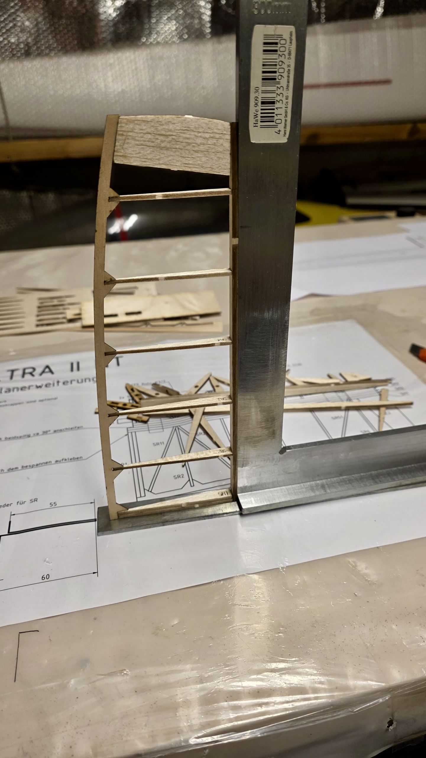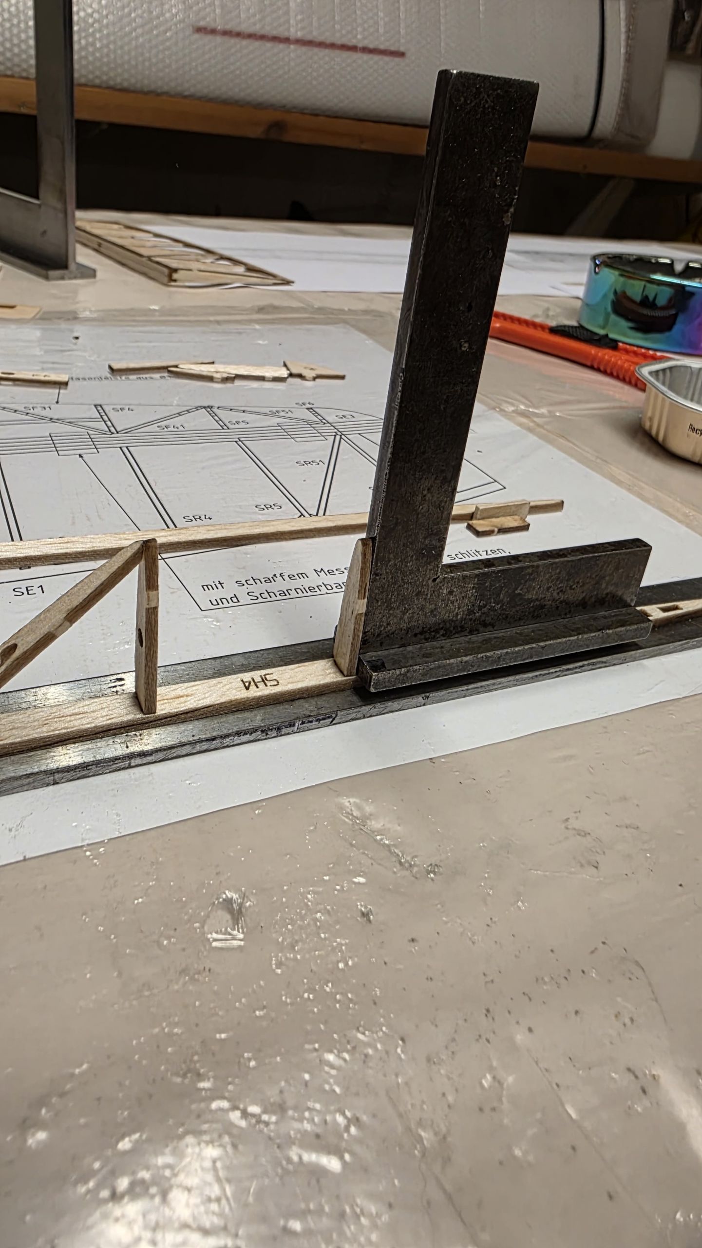 📐 Zuerst habe ich den Rumpf zwischen zwei Winkel gestellt und durchgepeilt, um die genaue Ausrichtung sicherzustellen.