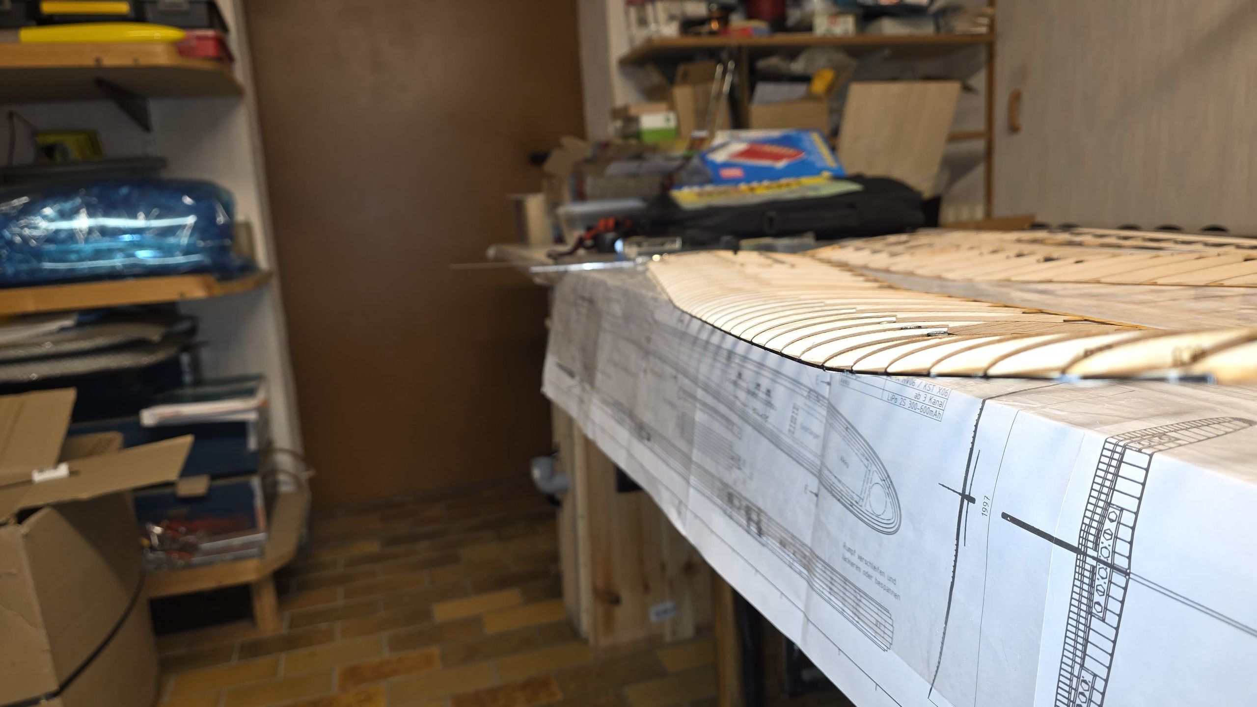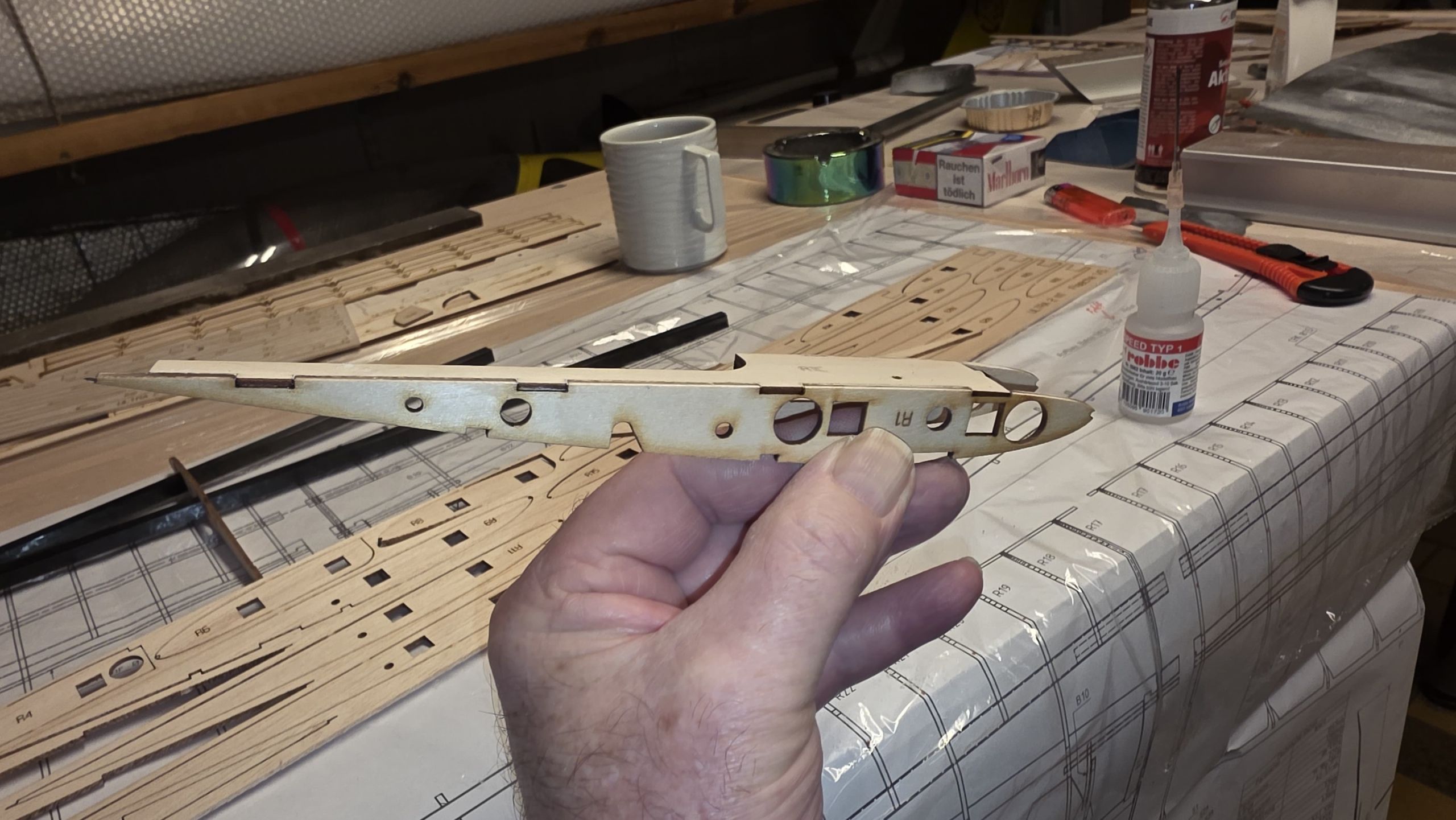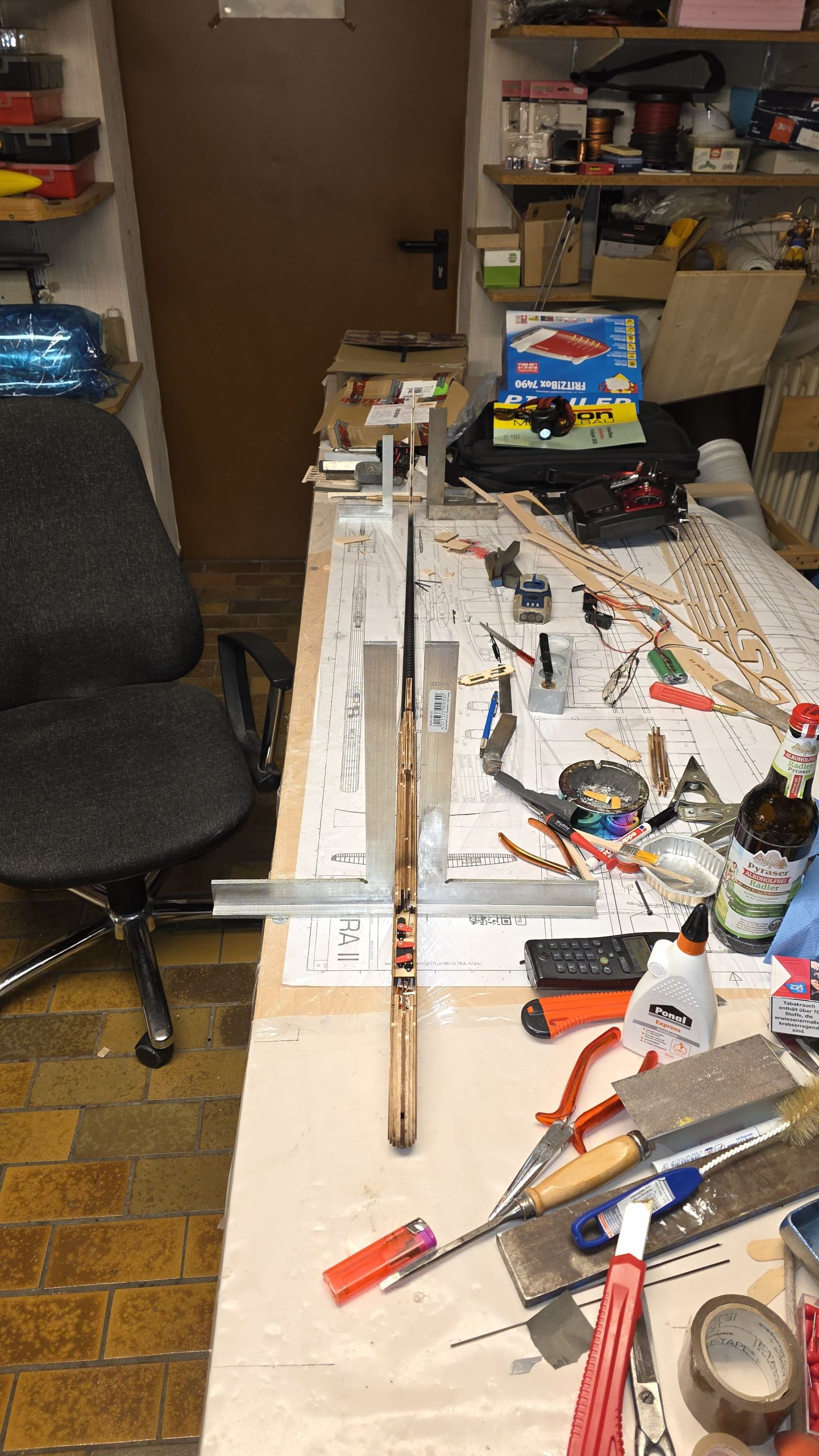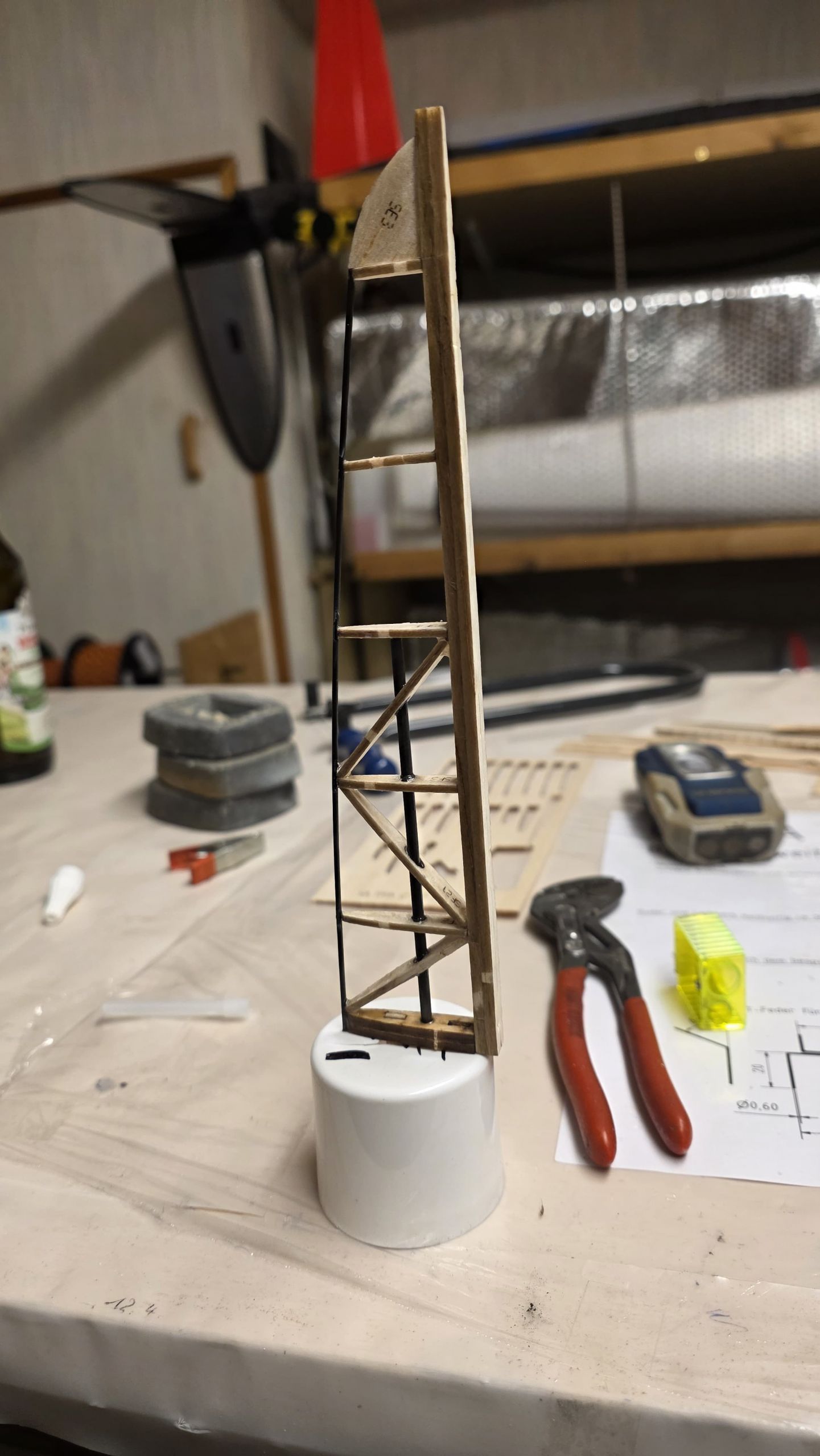 📐 Zuerst habe ich den Rumpf zwischen zwei Winkel gestellt und durchgepeilt, um die genaue Ausrichtung sicherzustellen.