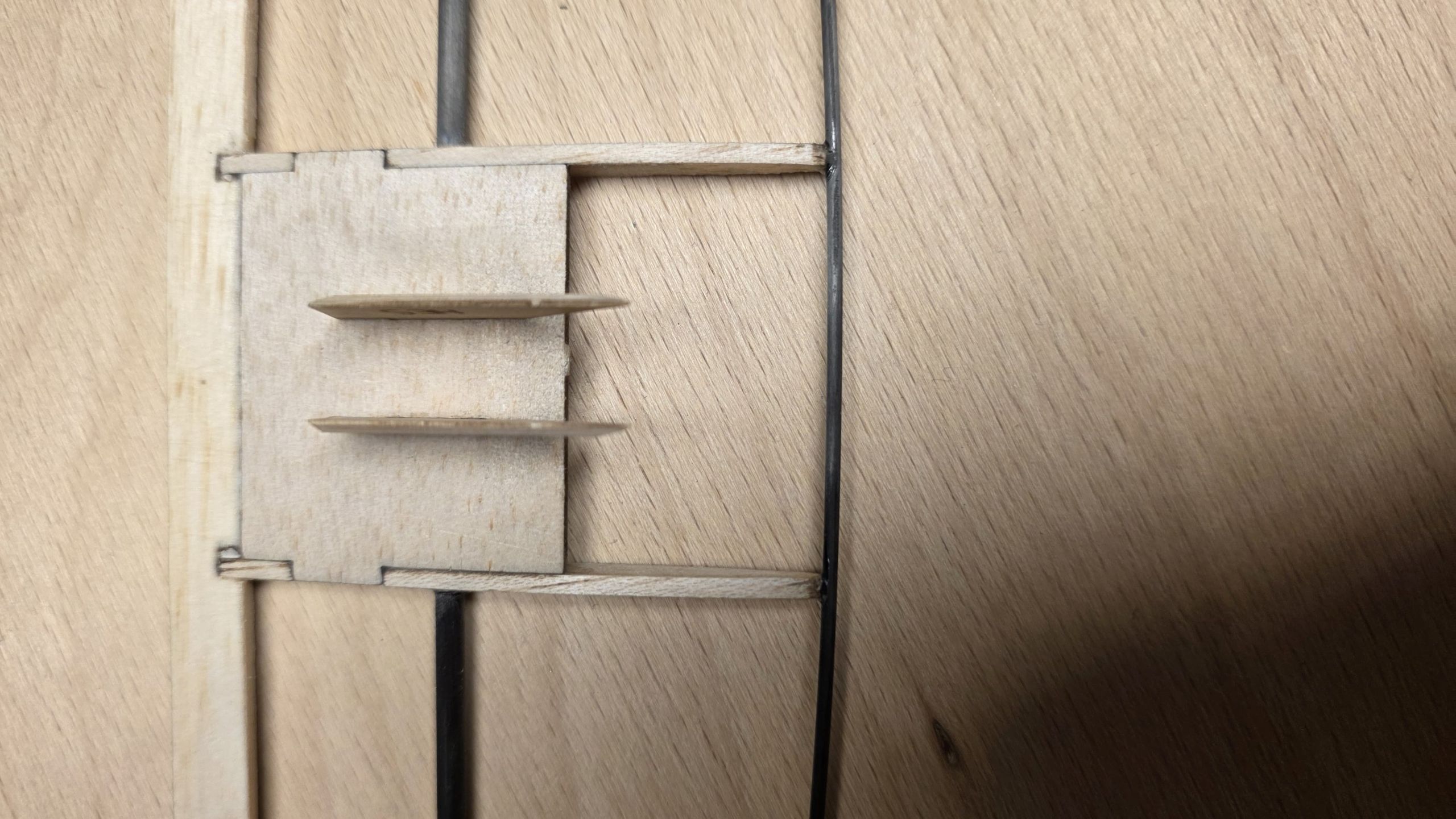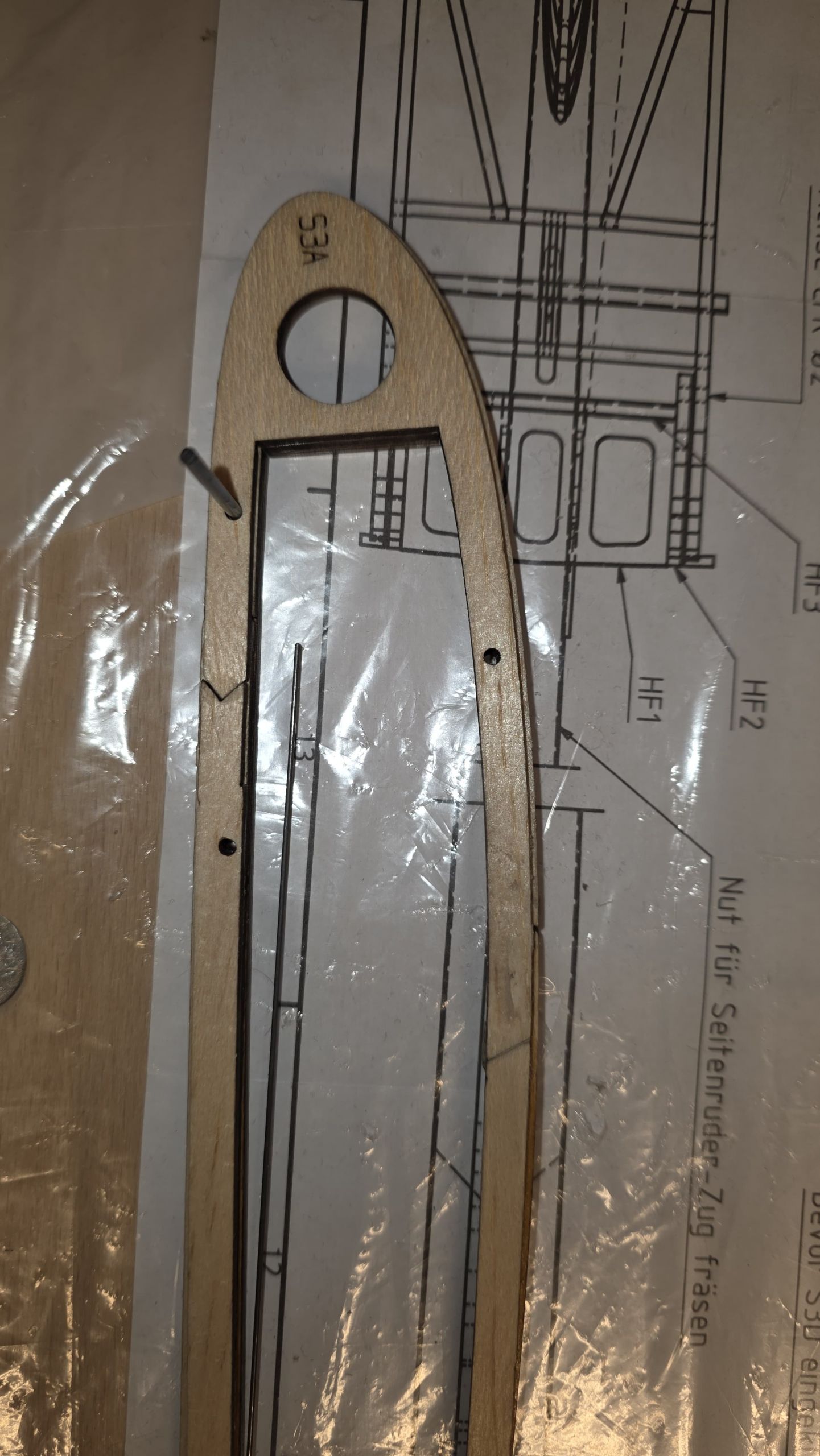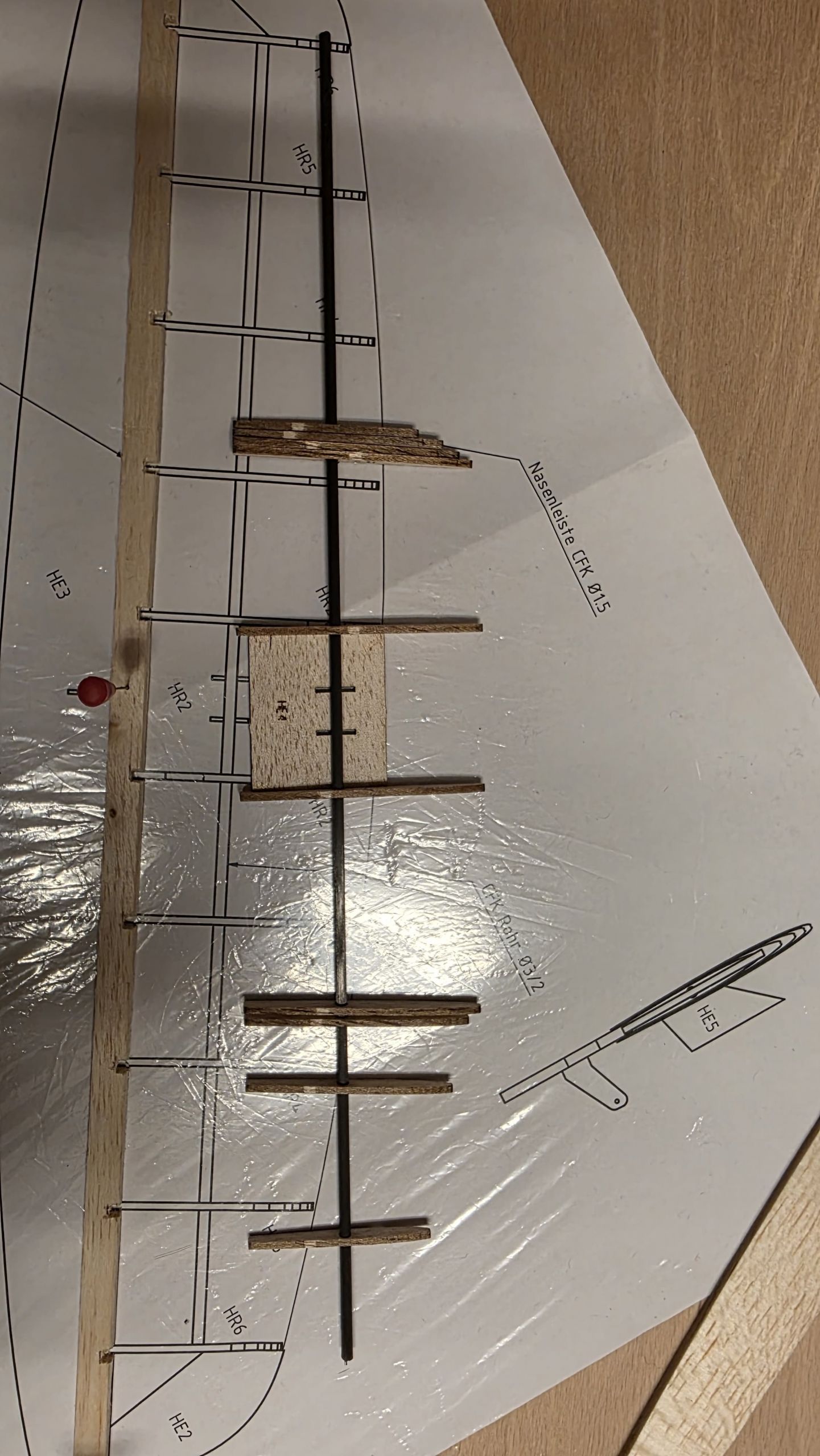 - Am Seitenruder die zwei Holzplatten sowie das 3‑mm‑Rohr so weit kürzen, dass sie auf der Innenseite des Rumpfrohrs unten gerade anliegen, während das Seitenruder oben sauber am Rohr ansteht.