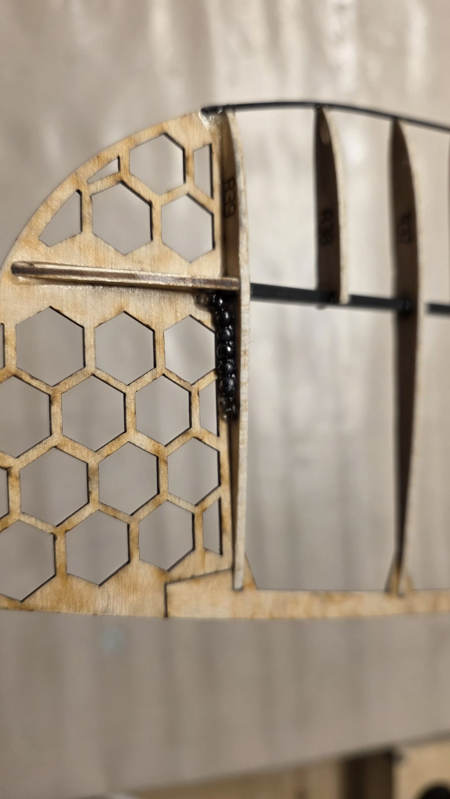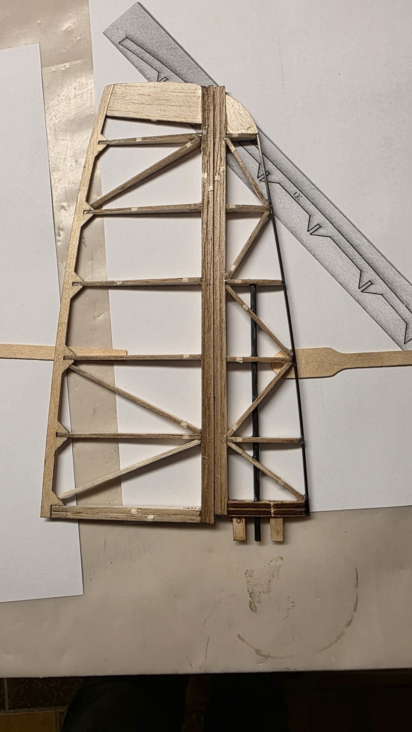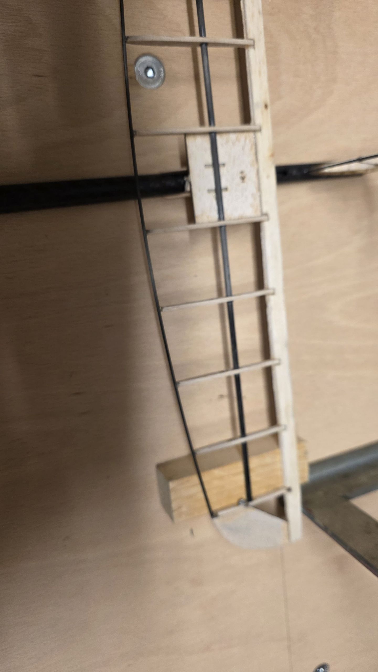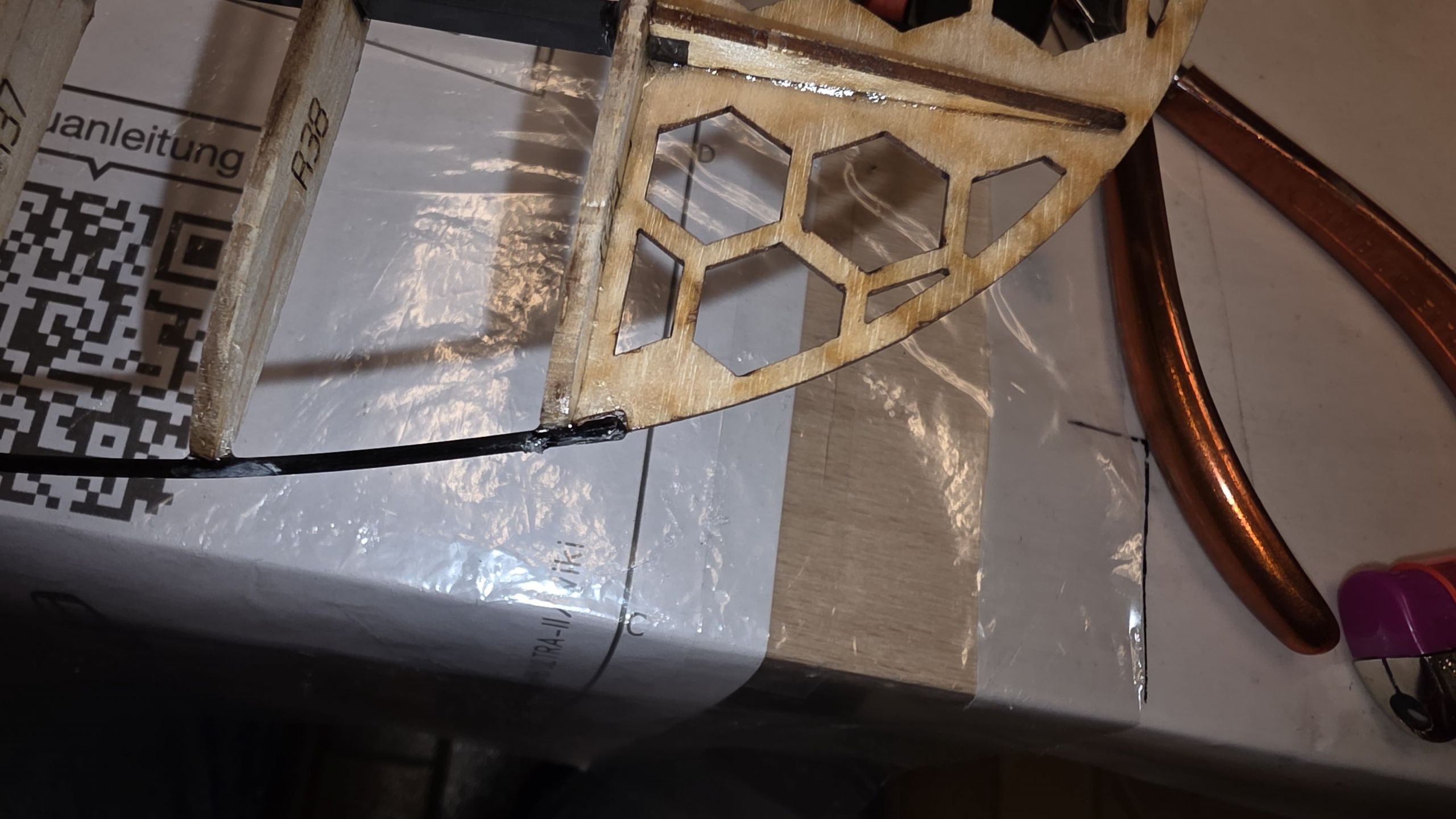 - Am Seitenruder die zwei Holzplatten sowie das 3‑mm‑Rohr so weit kürzen, dass sie auf der Innenseite des Rumpfrohrs unten gerade anliegen, während das Seitenruder oben sauber am Rohr ansteht.