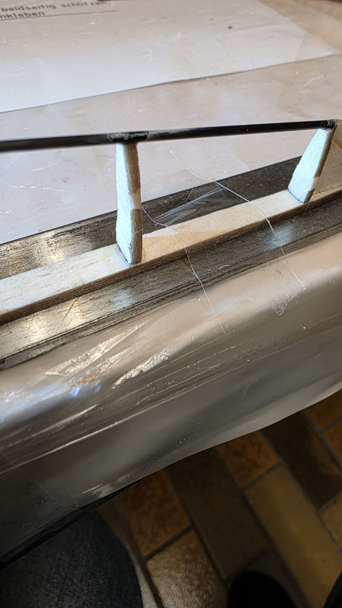 📏 Ich habe das Rohr auf das Rumpfvorderteil aufgeschoben – so, dass der Seitenruderausschnitt am Heckausleger nach oben zeigt.