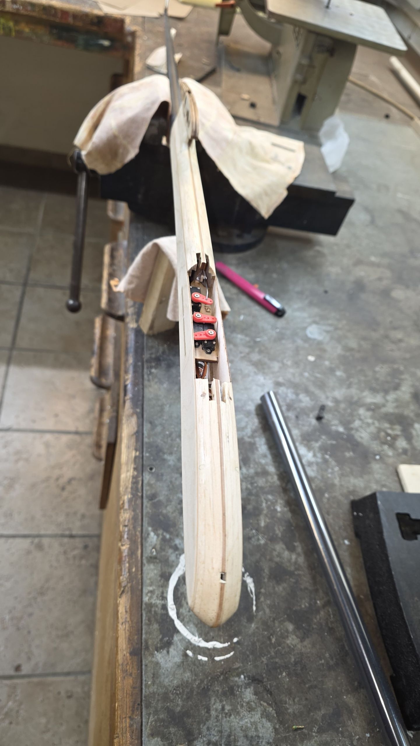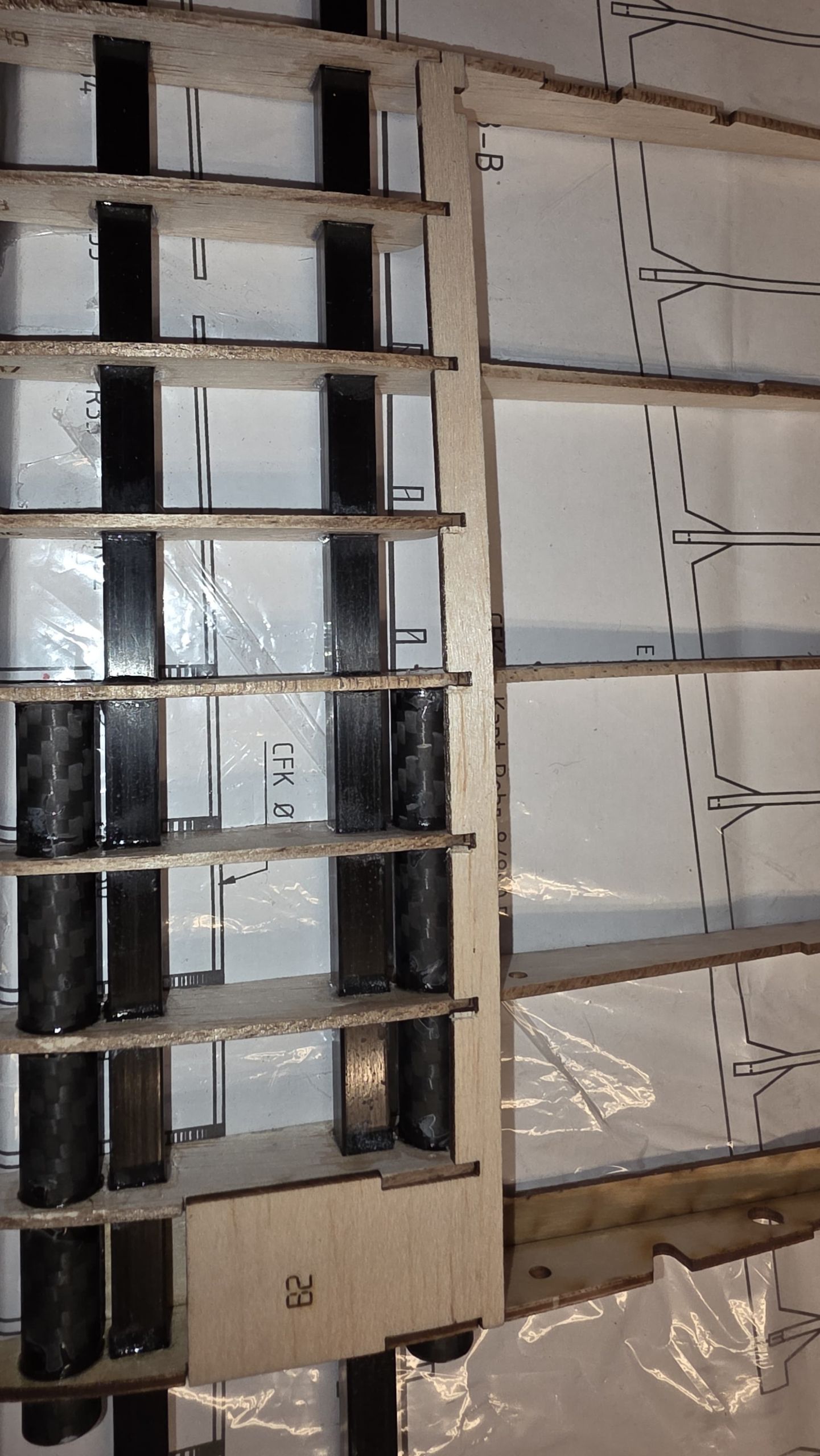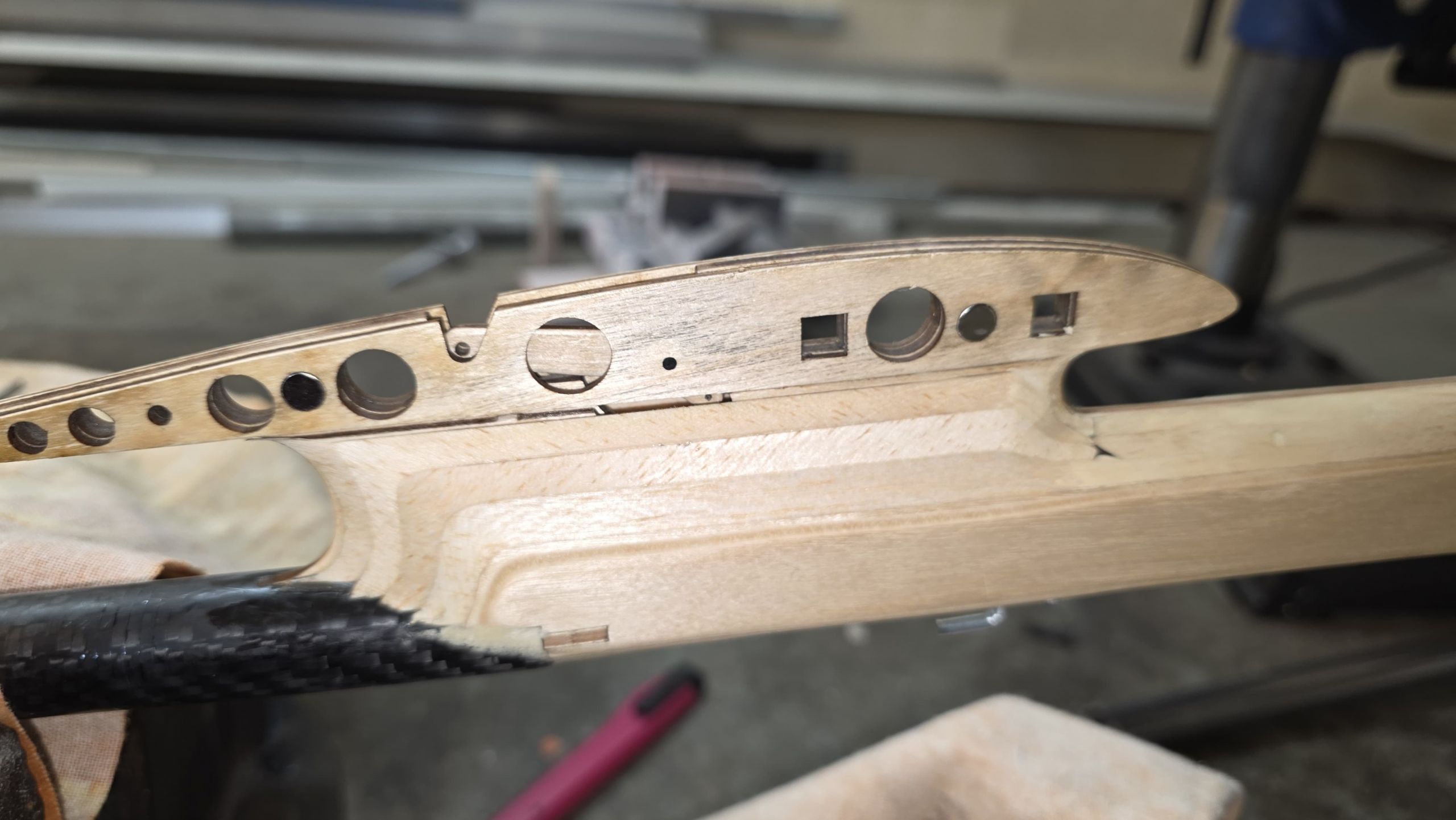 - Das Loch für den CFK‑Stab fräsen (nicht bohren!).